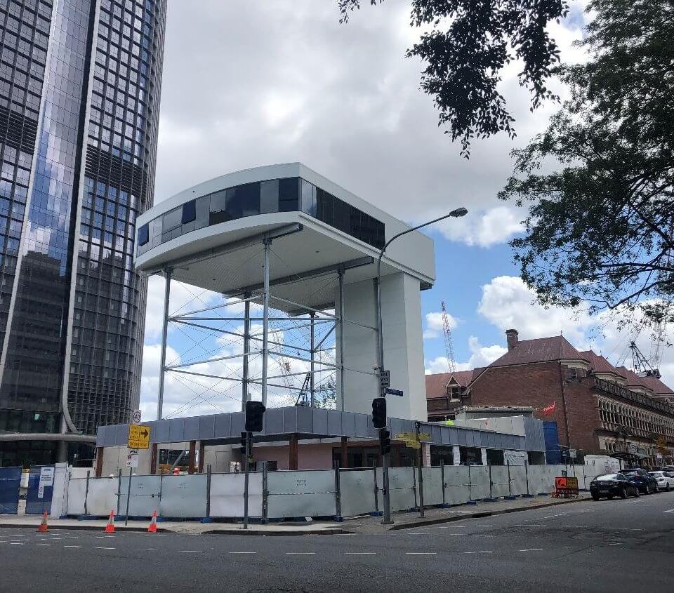 The Queen’s Wharf Residences display suite was lifted and locked into place at 5 stories above George Street and will provide views south across the river and to the Botanical Gardens from actual mock-ups residential apartments.